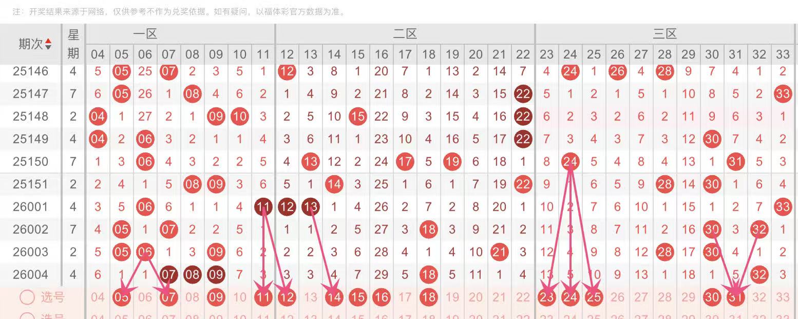 红球三区比:本期红球三区比为 4:1:1,近五期红球区间比分别为 2:2:2,3:2:1 ,3:1:2, 3:1:2,4:1:1本期预计红球三区比为 2:2:2。