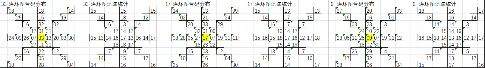 由于数据量大,不一一统计,下图为各个号码分别在33、17、9连环图上的遗漏统计汇总图: