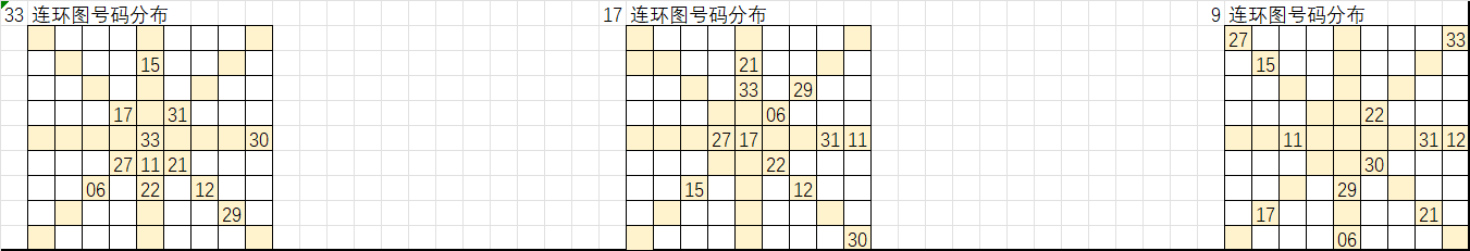 以上是遗漏大于16的号码分别在33、17、9连环图的分布,按照九转连环图选号规律,选取这些号码“环上”和“轴上”的相邻号码作为胆码,把这些胆码进行次数统计即可形成我们组号的排序,从出次多到少进行取号得出我们的大底。