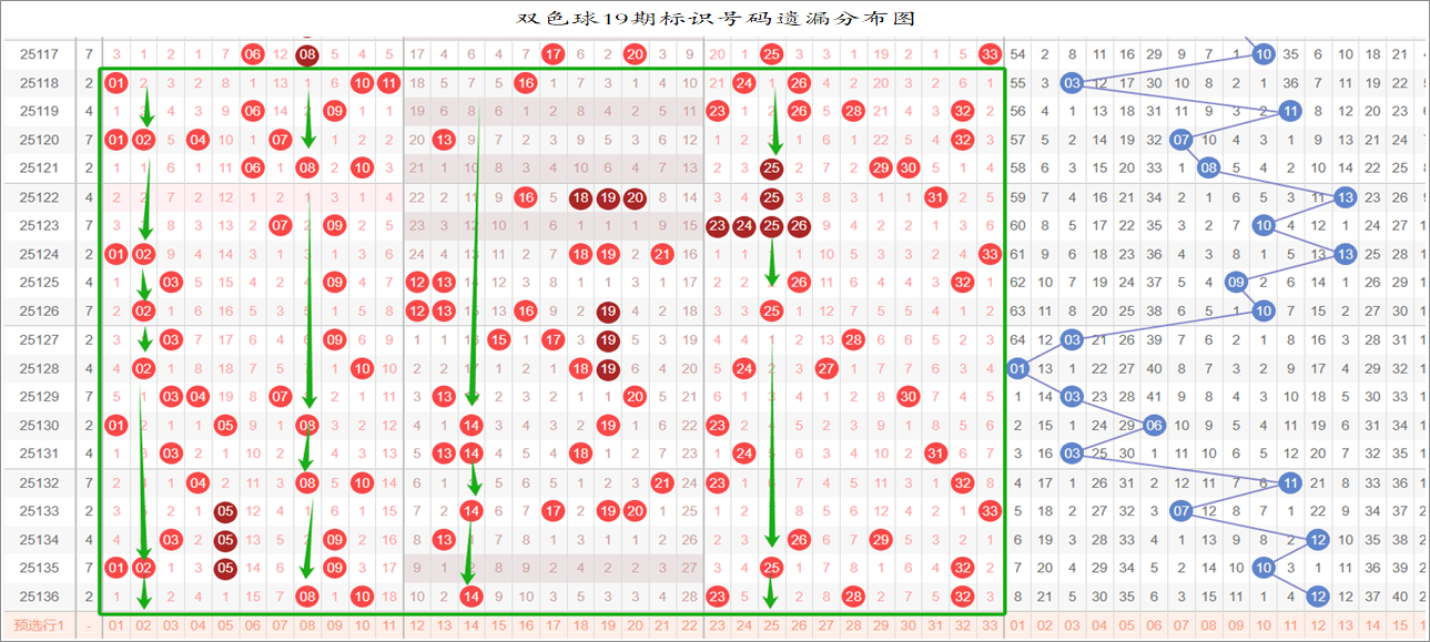 以上是33、17、9的连环图,可以在一起彩平台的九转连环图中查看历期号码分布,以当前期数来看,我们以19期号码来进行遗漏统计,然后把每个号码在近19期的遗漏总数统计出来,分别带入33、17、9的连环图,取出遗漏值大于16的号码,把这些号码在“环上”和“轴上”的相邻号码取出来进行统计,选取出次前15的号码作为大底。
