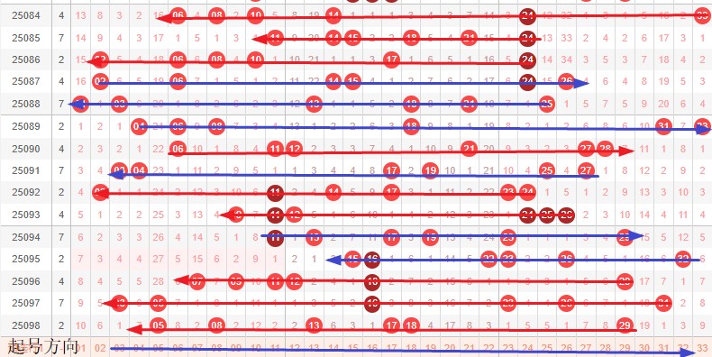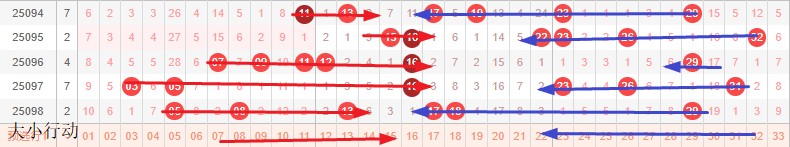 如图所示:体现的是3个局部走势的发展周期,圆圈为密集处的填空,本期定性为新局部走势1期画线期,造成号码密集主动调整空间,即大小行动本期挑战一个空间体现小号前进和大号后退,而预估蛋跨后移,代表本期2-3区交界处有大空间。本期走势切入在于8-12和18-29空间的2选1填空。预计本期小号多开,体现在连号重号同尾上。或形成小号小范围密集,即本期形态为淘汰点。