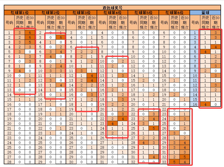 第6位,基本在24-33之间,历史同期频次最多的33;近30期,频次最多的为32,明显特征是合数优势;推荐重24-28-29-30-31-32-33。