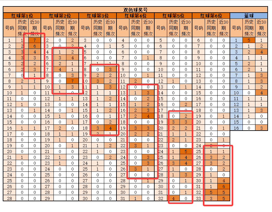 第5位,基本在16-31之间,历史同期频次最多的为32;近30期,频次最多的为24,明显特征是偶数优势;推荐重点19、24、25、26、28、32。