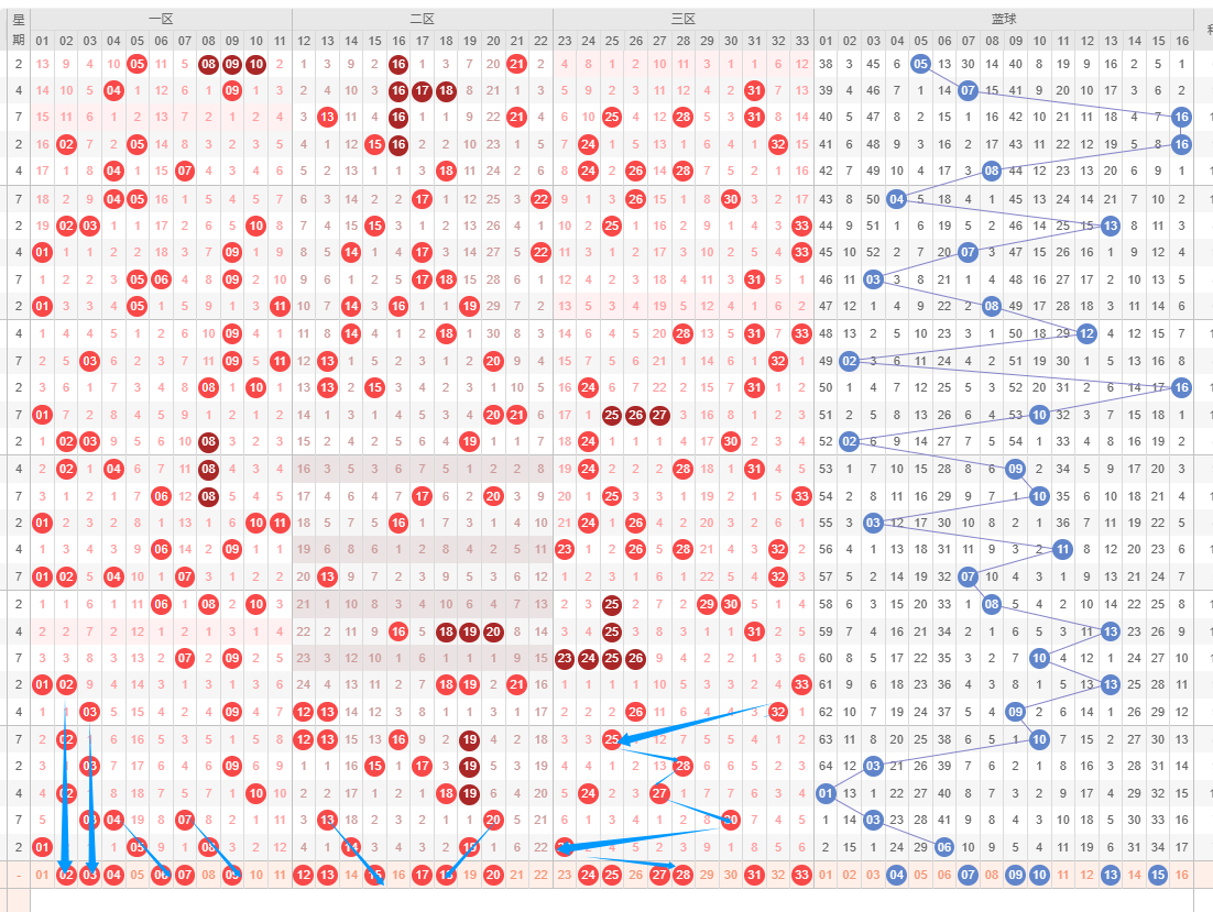 蓝球,历史同期频次最多的为1;近30期,频次最多的为3-10,明显特征是1路优势;推荐重点1-3-7-8-10-13-16。