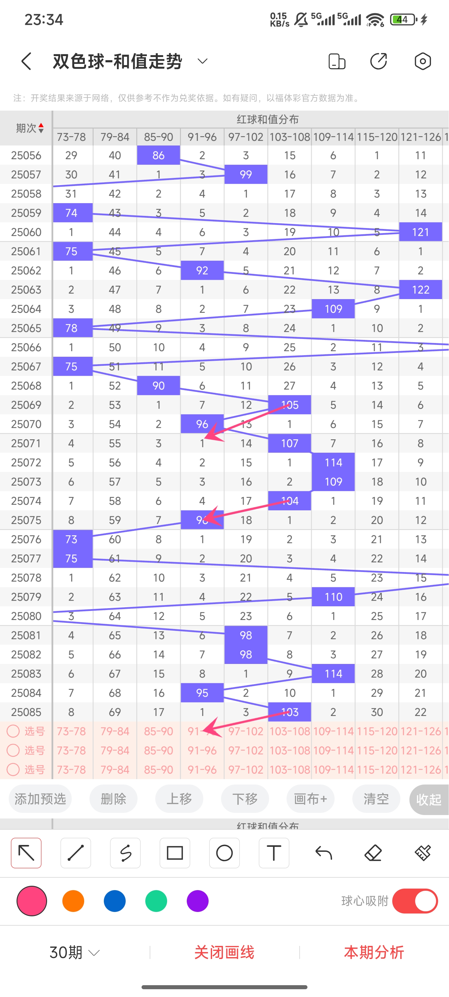 上期和值为103,而近5期和值为98,98,114,95,103均值101.6,上期和值较前一期增大了8,振幅为8。103和值也是属于中间偏大一点的和值,目前比较大概率会往左下降,小概率继续上升。