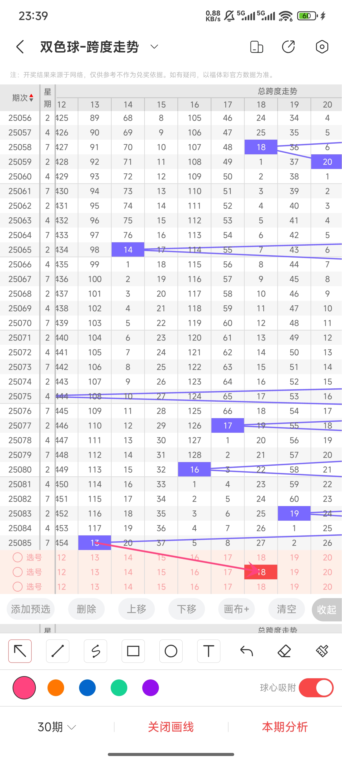 上期龙头为11,凤尾为24,跨度为13,跨度值是比较小的了。属于目前30期内开出小和值内第二小的了。所以下降的空间非常小。通过综合走势图和历史数据,目前趋势应该是往右移动,跨度增大。