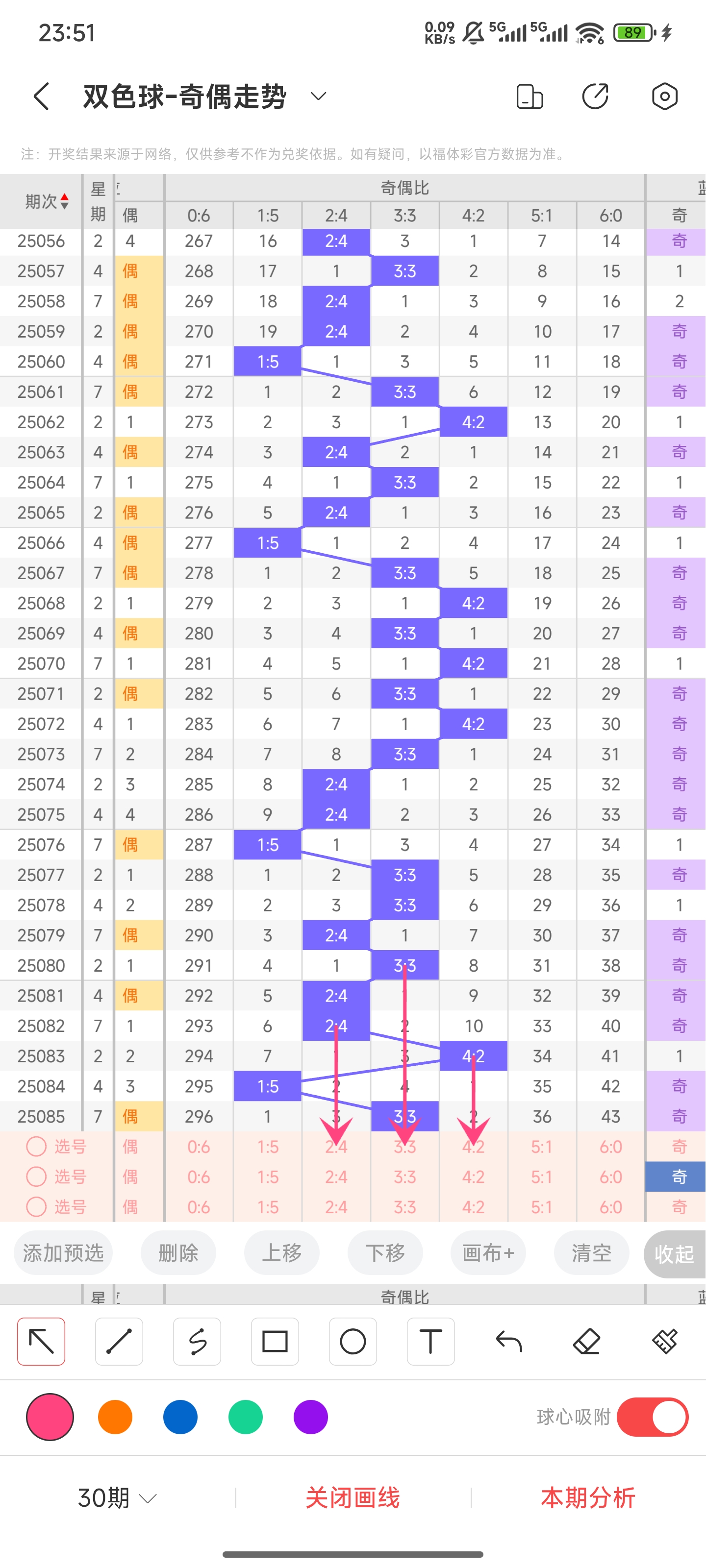 上期奇偶比为1:5,分别为奇偶奇偶奇偶。往前一期奇偶比为4:2。通过近30期内奇偶走势的数据分析,目前1:5奇偶比开出的概率是13.33%,4:2奇偶比开出的概率是16.66%,2:4奇偶比开出的概率是33.33%,3:3奇偶比开出的概率是33.33%,其余类型为0%。从目前开出的概率上看,2:4和3:3奇偶比更容易开出,但4:2目前的开出概率比较低,可能会开出,从而提高概率。但比较大概率还是可能开2:4或者3:3奇偶比。
