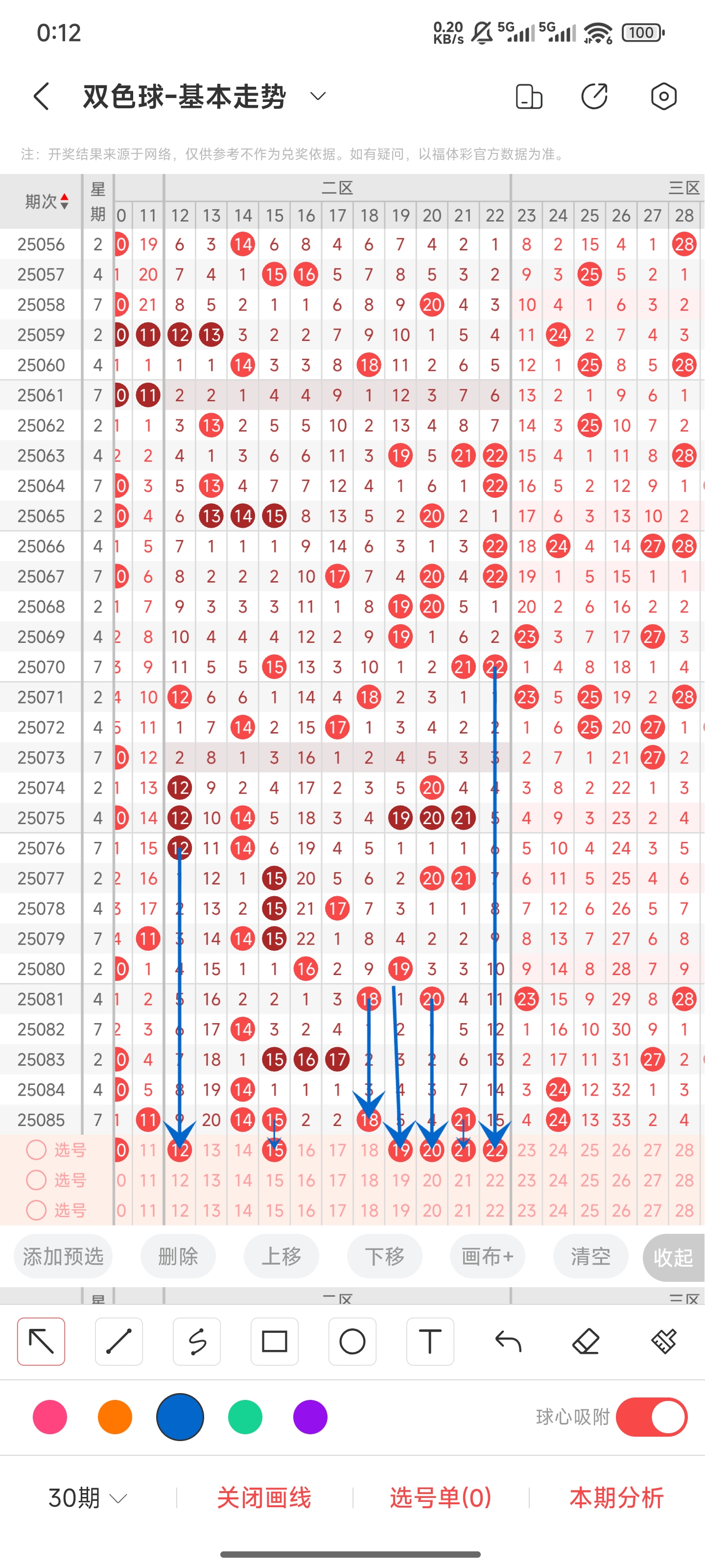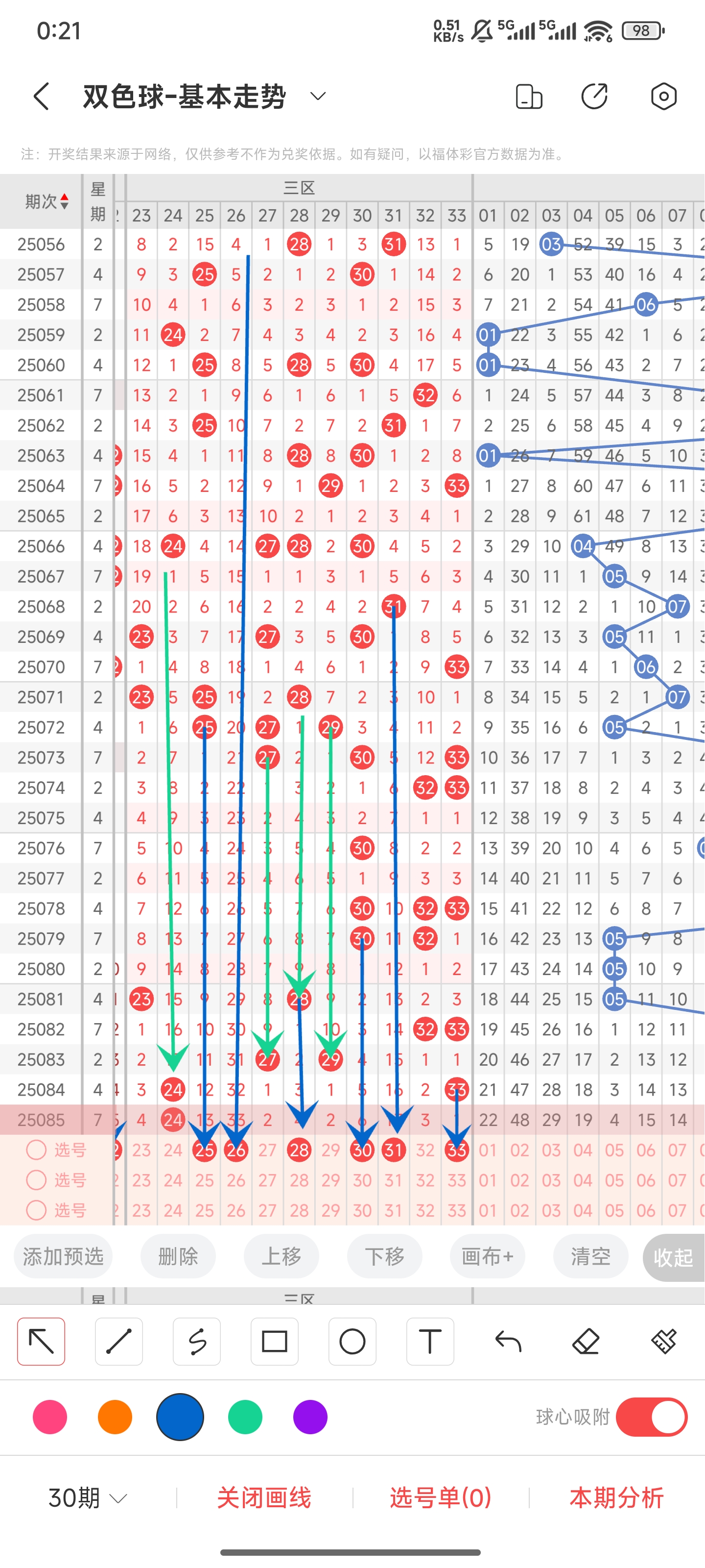 上一期三区开出24。往前一期开出的是24和33。前面一期我们猜测可能是33会连出,没想到是24。因为24是冷号回归,且已经连续开出了,我们就不在考虑连出了。那么本期通过分析走势图我们可以看到最近几期多数都是冷号回归。那么我们就要关注一下冷号了。例如冷号25,26,31。而比较热门的我们可以关注28,30和33。所以本期我们推测有可能开出25,26,28,30,31,33等号码。