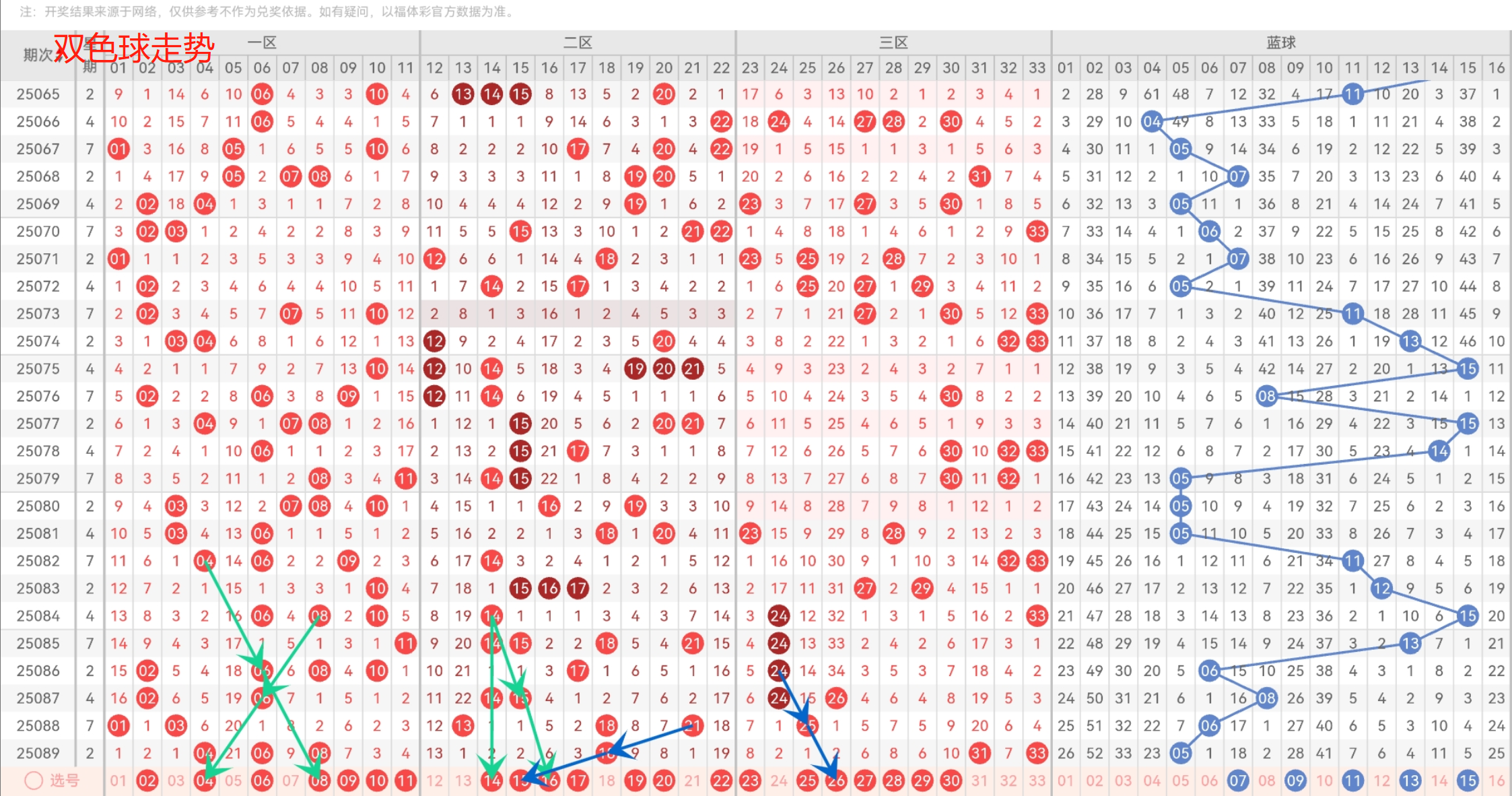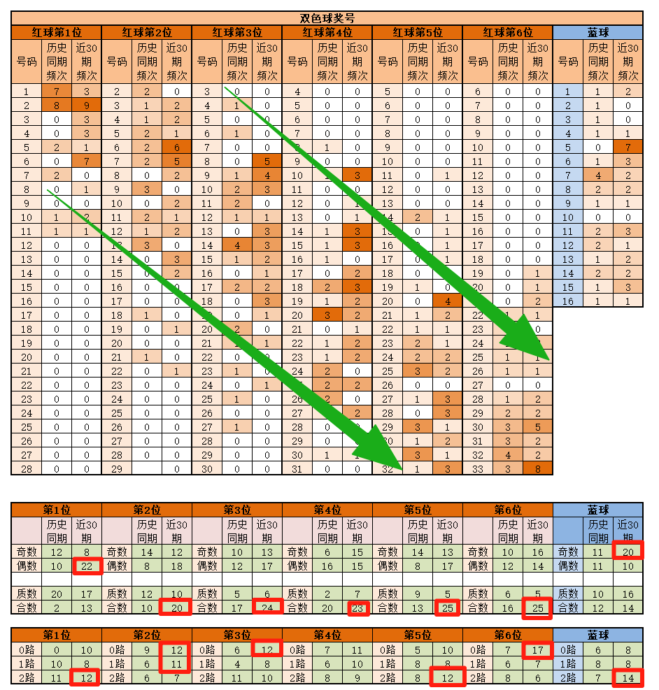 第6位,基本在21-33之间,历史同期频次最多的为32近30期,频次最多的为33明显特征是合数和0路优势;推荐重点30-33。