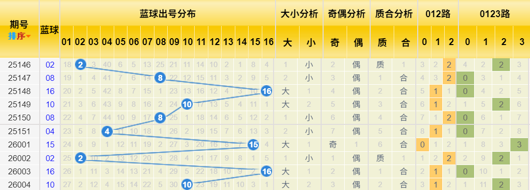 1. 热冷温与012路双维透视:历史同期近10期周日蓝球012路比为3:4:3,分布均衡。但观察近期,0路号码已连续遗漏3期(最近三期开10、16、10,其中16为0路,10为1路)。近10期蓝球012路比为3:3:4,2路略优。但0路同样呈现阶段性遗漏态势。上期开出中偶数10。近期大号(5次)略多,奇偶分布均匀。