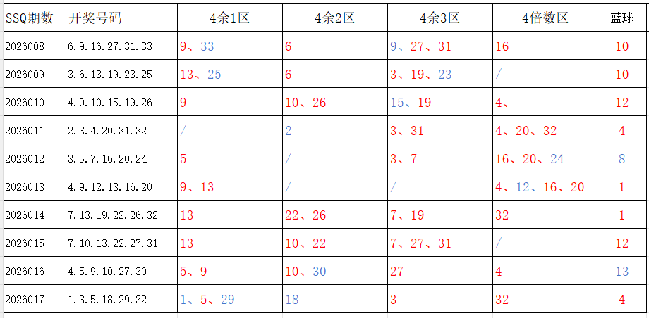 分享第一个数据分析:四分区统计数据。相对于传统的三分区,个人习惯使用四分区,就是把33个红球号码除以4,所得的余数分区如下: