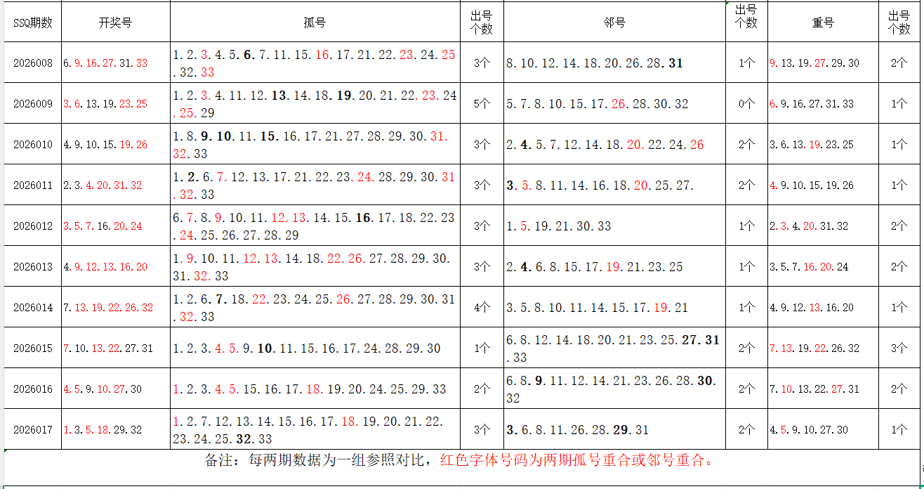 如图,以近两期数据为一组,进行对比分析。相同的孤号、邻号,可能在下期出1-4个左右。上期开出孤号3个,邻号2个,重号1个。本期参考孤号:7.8.9.10.11.12.13.14.15.16.20.21.22.23.24.25.26.27;邻号:2.4.6.17.19.28.30.31.33;孤、邻号重合号码精选:***(会员专区可见)。个人分析,仅供参考。