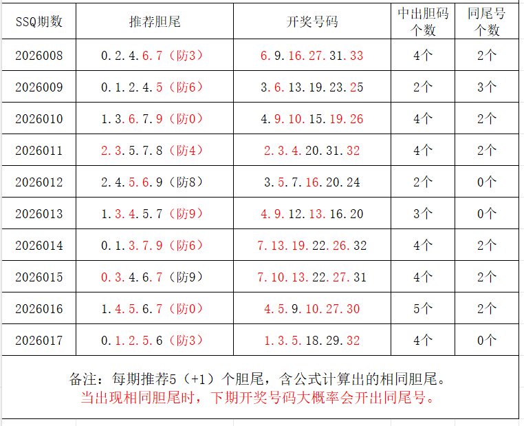 如图,每期推荐胆尾中出1-4个。上期推荐胆尾中出4尾4码!推荐胆尾是按照公式计算的顺序,不定位红球号码的顺序。本期推荐胆尾:8尾/4尾/5尾/3尾/2尾 。加推重点胆尾:***(会员专区可见)。推荐胆码号码:***(会员专区可见)。个人分析,仅供参考。