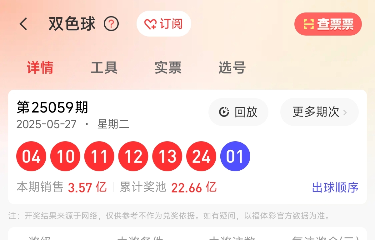 首先让我们回顾一下上期双色球25059期的开奖号码为04、10、11、12、13、24,蓝球01。和值74,跨度20,区间比为3:2:1,奇偶比为2:4。