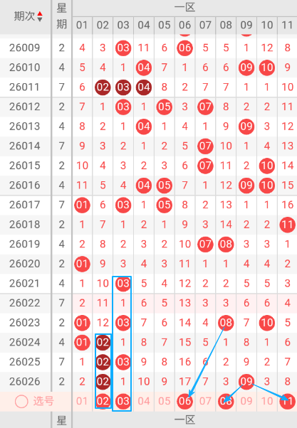 根据走势图可以看出当区段,017期开出01.03.05三个号码球 ,018期开出11一个号码球 ,019期开出07.08二个号码球 ,020期开出01一个号码球 ,021期开出03一个号码球 ,022期没有开出个号码球 ,023期开出01.03.08.10四个号码球 ,024期开出01.02二个号码球 ,025期开出个02.03二号码球 ,026期开出02.09二个号码球 ,按照如此规律本期当前区判断可能会开出1单1双。我们看下当前区上期开出02重叠号,那么本期当前区要定重叠号的情况下可关注02号码球。再看下当前区段上期开出02斜连号,当期选号得留意03斜连号。建议重点关注002.03.06.08.11