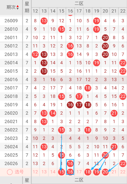 根据走势图可以看出当前区段,016期没有开出号码球 ,017期开出18一个号码球 ,018期开出15.17.22三个号码球 ,019期开出16.17.18三个号码球 ,020期开出13.14.21三个号码球 ,021期开出13一个号码球 ,022期开出15.18二个号码球 ,023期没有开出号码球 ,024期开出13.21二个号码球 ,025期开出15.20二个号码球 ,026期开出16.22二个号码球 ,按照如此规律本期当前区可能开出1单1双。我们看下当前区上期没有开出重叠号,那么本期当前区要定重叠号的情况下可关注16号码球。再看下当前区上期开出16斜连号,当期选号得留意斜连15号码球。本区重点关注15.16.18.19.20