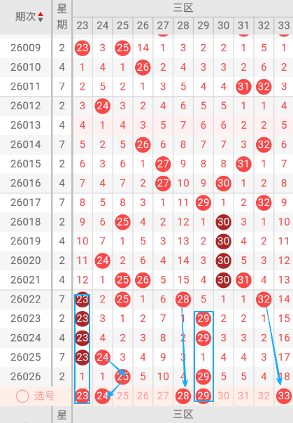 根据走势图可以看出当前区,017期开出29.32二个号码球 ,018期开出25.30二个号码球 ,019期开出30一个号码球 ,020期开出24.30二个号码球 ,021期开出25.26.30.31四个号码球 ,022期开出23.25.28.32四个号码球 ,023期开出23.29二个号码球 ,024期开出23.29二个号码球 ,025期开出23.24二个号码球 , 026期开出25.29二个号码球 ,按照如此规律判断本期当前区可能开出1单或1单1双。我们看下当前区上期没有开出重叠号,那么本期当前区要定重叠号的情况下可关注29码球。再看下当前区上期开出25斜连号,当期选号得留意28斜连号。本区重点关注23.24.28.29.33
