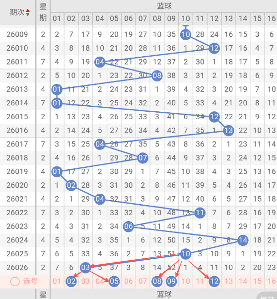 根据走势图近10期的走势看,蓝球在14期开出01蓝球之后,2大5小1大1小2大1小,再看下近10期的蓝球冷码有回补的趋势,这种趋势规律本期判断极有可能开小号,本期防蓝球11大号,蓝球本期重点关注02,05,08,09.12
