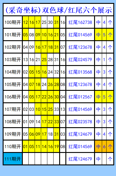 双色球第111期图文(采奇坐标),红尾六个展示,上期围出六红二奖