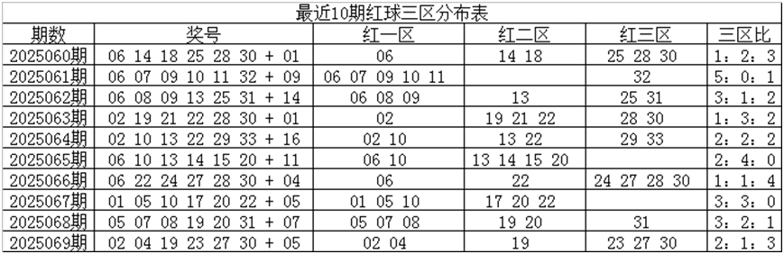 一区上期走温,出现2个奖号,近10期开出23个红球,表现非常活跃,本期预计走温,开出1-2个红球,参考号码01、05;二区上期走温,开出1个红球,近10期共开出19个红球,出号比例与理论持平,本期预计继续走温,出现1-2个红球,注意号码12;三区上期表现较热,出现3个奖号,近10期共开出18个红球,出号与理论个数持平,本期看好走热,开出3个红球,看好号码23、26、27;