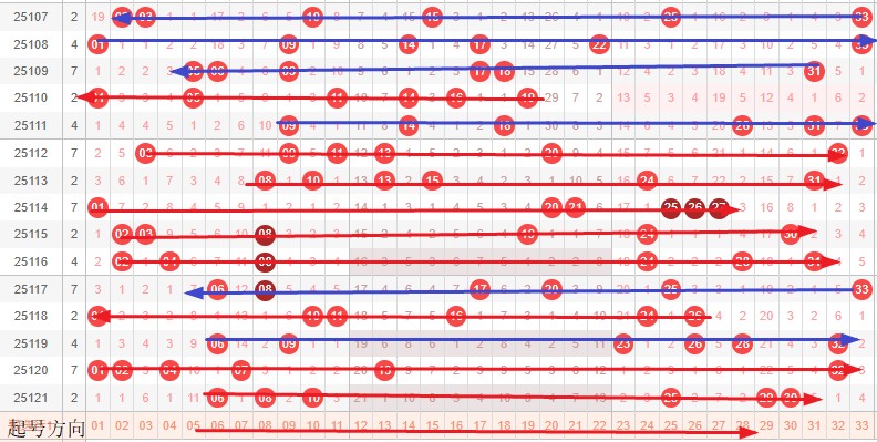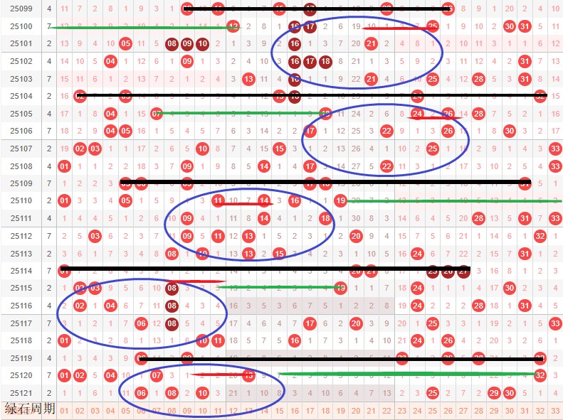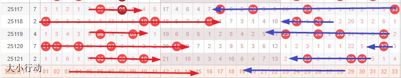 如图所示:体现的是3个局部走势的发展周期,圆圈为密集处的填空,本期定性为新局部走势4期,主力填空第2期,架构填空第1期期,定性本周期蛋跨6-16,真实空间为17-32,大小行动要求大小合拢,2区具备大小号,只能左推平衡起号,2组连号具备基础。如左推首尾蓝球小于8,如拉伸首尾蓝球大于8.