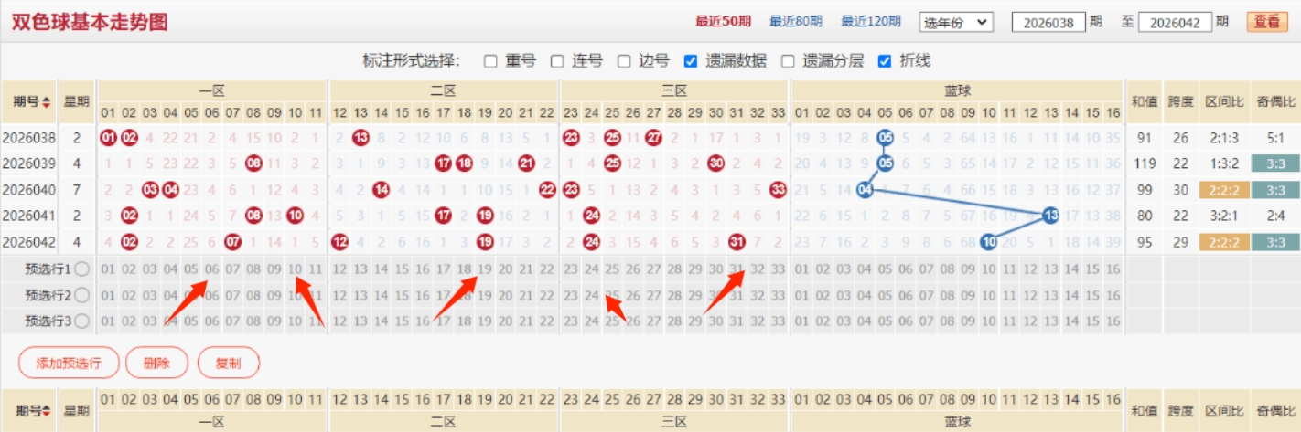上期双色球的开奖号为:02 07 12 19 24 31+10,和值为95,跨度为29,区间比例为2:2:2,奇数偶数比例为3:3,012路比例为2:3:1。上期双色球号码的整体特征趋势主要集中在三个重号。虽然这一块将难度非常大,是上一期双色球号码整体组合的间距全部都为跨度五或者是跨度七。本期号码将重点关注连号等层次趋势的聚焦组合。这是本期号码的初始基本思路。