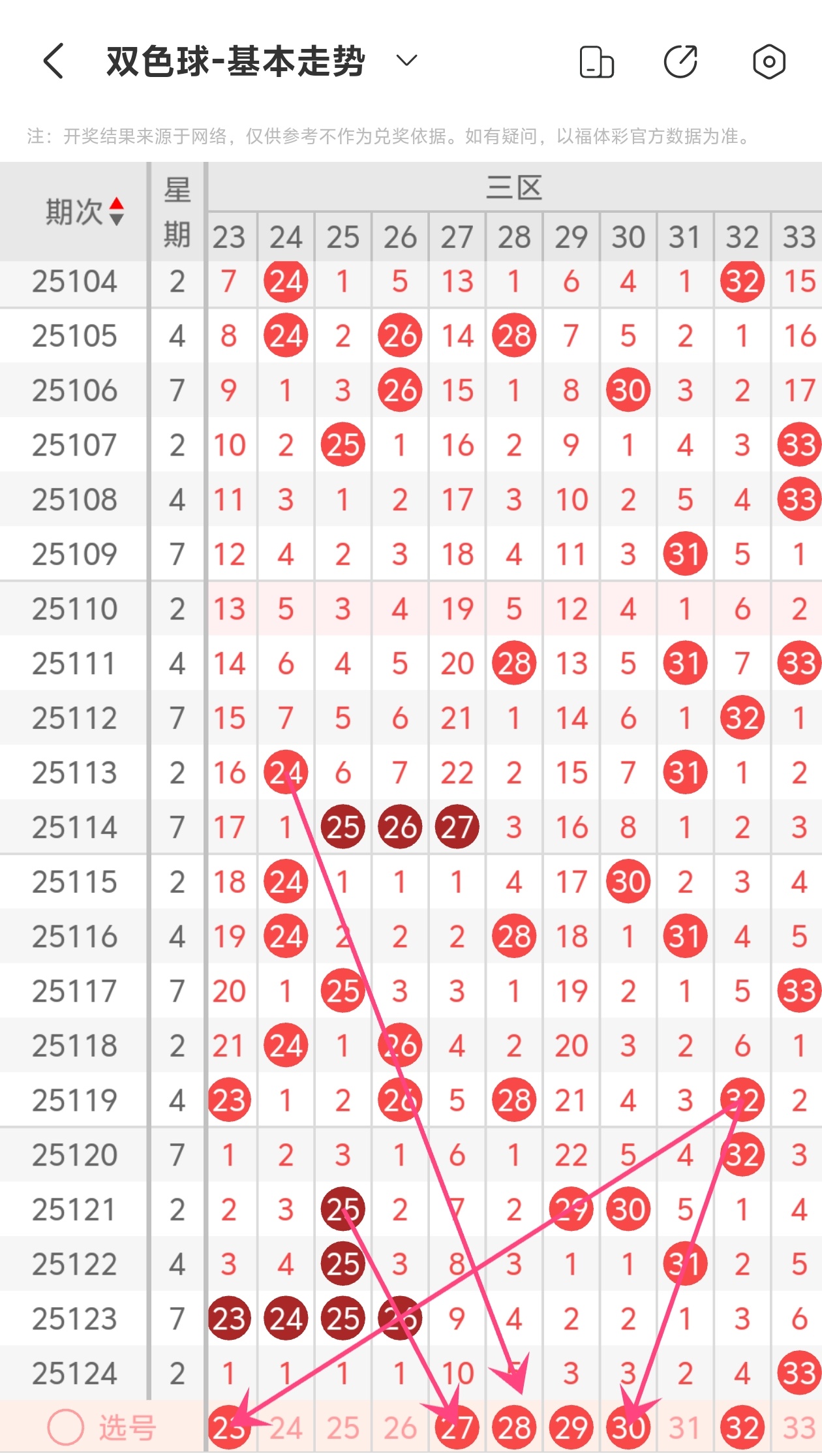 下面是我对2025125期福彩双色球的分析和预判,希望通过我的分析能让大家今晚大红!福彩双色球上期开奖号码如下图:
