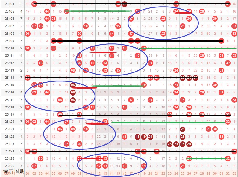 如图所示:体现的是3个局部走势的发展周期,圆圈为密集处的填空,本期定性为新局部走势4期,架构填空第1期,主力填空第2期期,定性蛋跨9-19,真实空间25-32,本期绿色线左推,开出拉伸或者左推首尾,蛋跨预估2-3枚。本期优先小号多开。