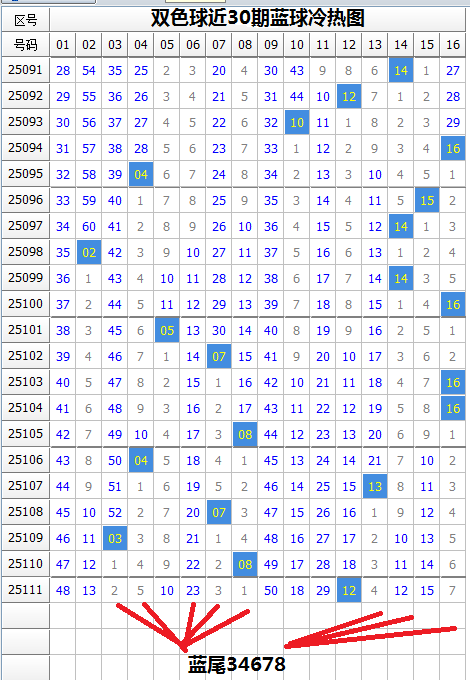 蓝球本期有热蓝7枚,冷蓝9枚,蓝球冷码数量稍多。上期开出冷蓝,由于近期蓝球冷热交替开出规律不明显,本期蓝球冷热难定。