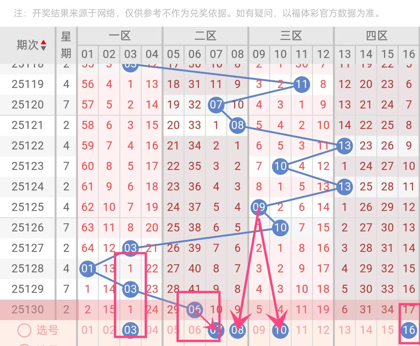频率热度:蓝球03和10各出现4次,07、08、16各出现3次,均属高频热号。选择这些号码基于其持续出号趋势,避免冷门。
