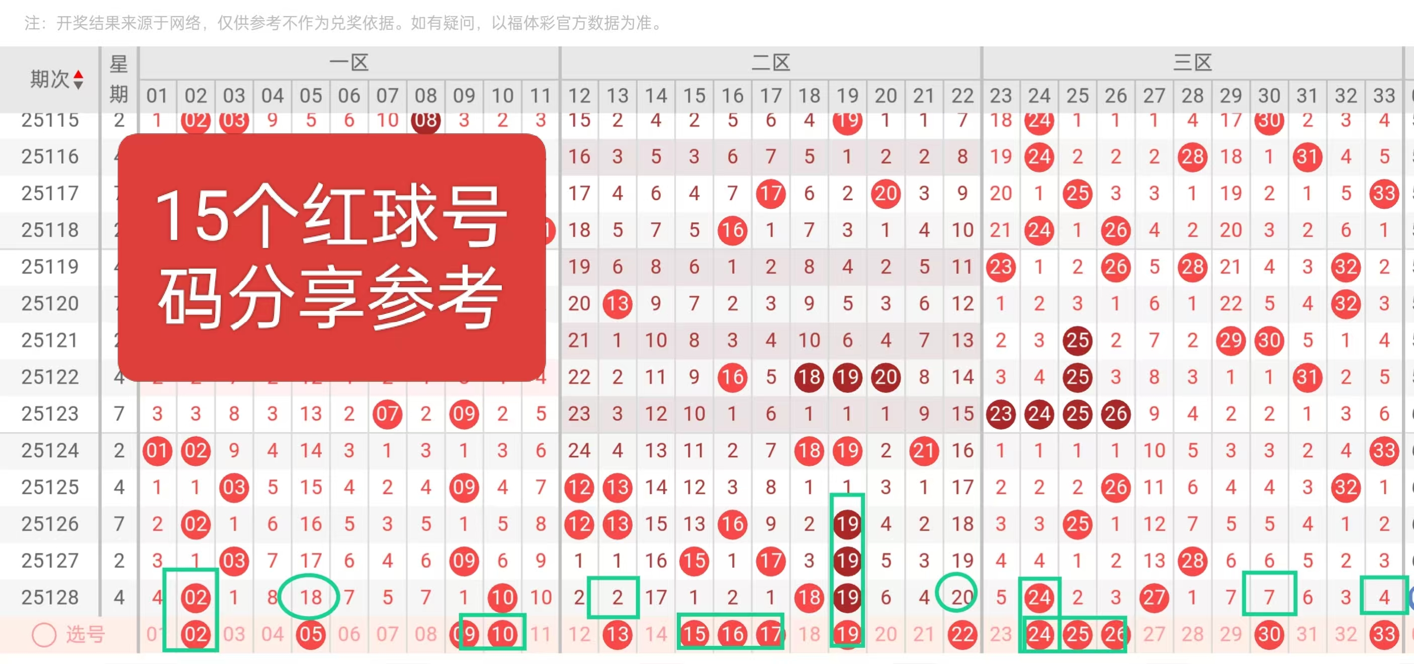 红球:02, 05, 09, 10, 13, 15, 16, 17, 19, 22, 24, 25, 26, 30, 33