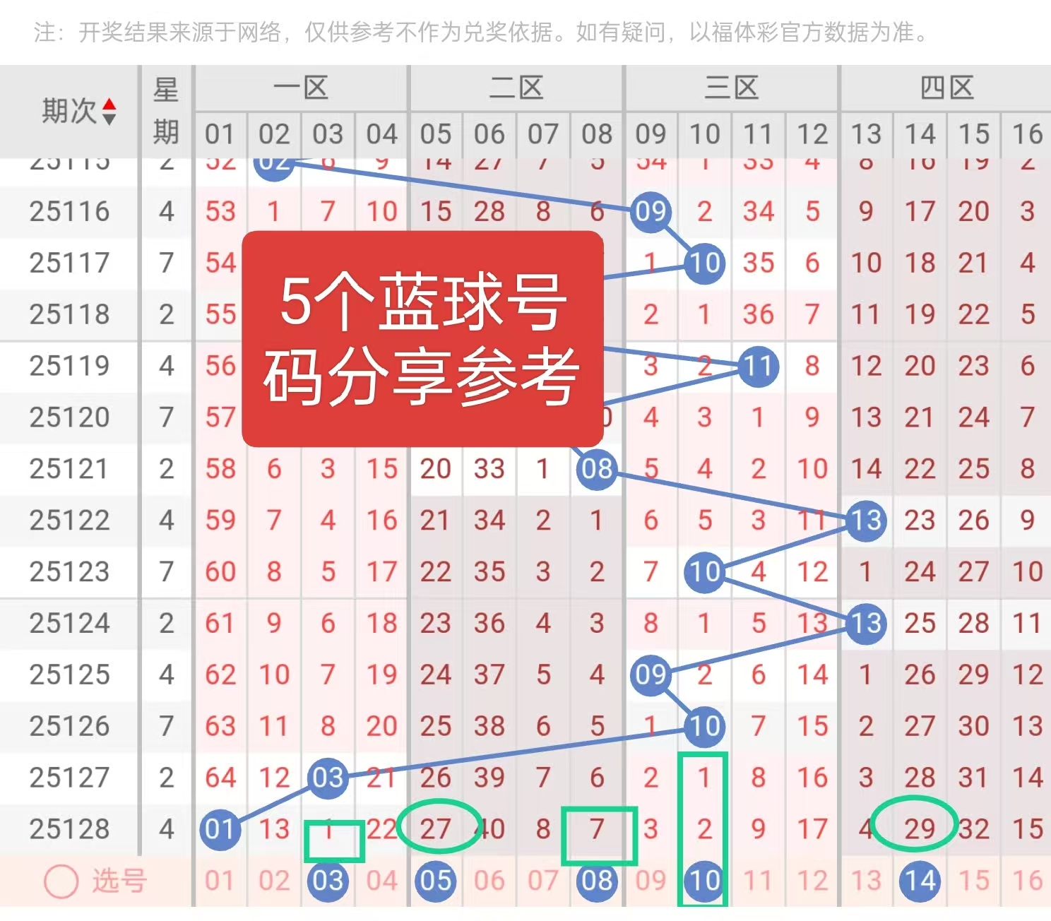 蓝球中,03、10 在近10期各出现2次,属于热号;05、08 也各有1次出现,且历史中频段表现稳定。