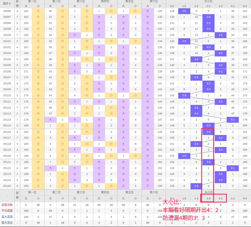 上期大小比:2:4,近10期大小比出现情况:3:3、4:2、2:4、4:2、1:5、3:3、5:1、4:2、4:2、2:4,最近10期出现2期3:3,出现4期4:2,出2期2:4,出现1期5:1,出现1期1:5,出现0期6:0,出现0期0:6,根据近10期规律本期看好隔期开出4:2,防遗漏4期开出3:3,综上所述推荐大小比推荐:3:3,重点关注:4:2。