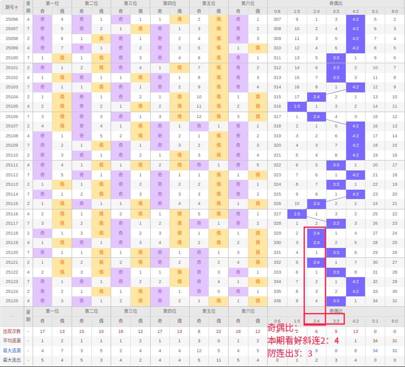 上期奇偶比:3:3,近10期奇偶比出现情况:1:5、3:3、2:4、2:4、3:3、2:4、3:3、4:2、4:2、3:3,最近10期出现4期3:3,出现2期4:2,出现3期2:4,出现0期5:1,出现1期1:5,出现0期6:0,出现0期0:6,根据近10期规律本期看好斜连2:4,防连出的3:3,综上所述推荐奇偶比推荐:3:3,重点关注:2:4。