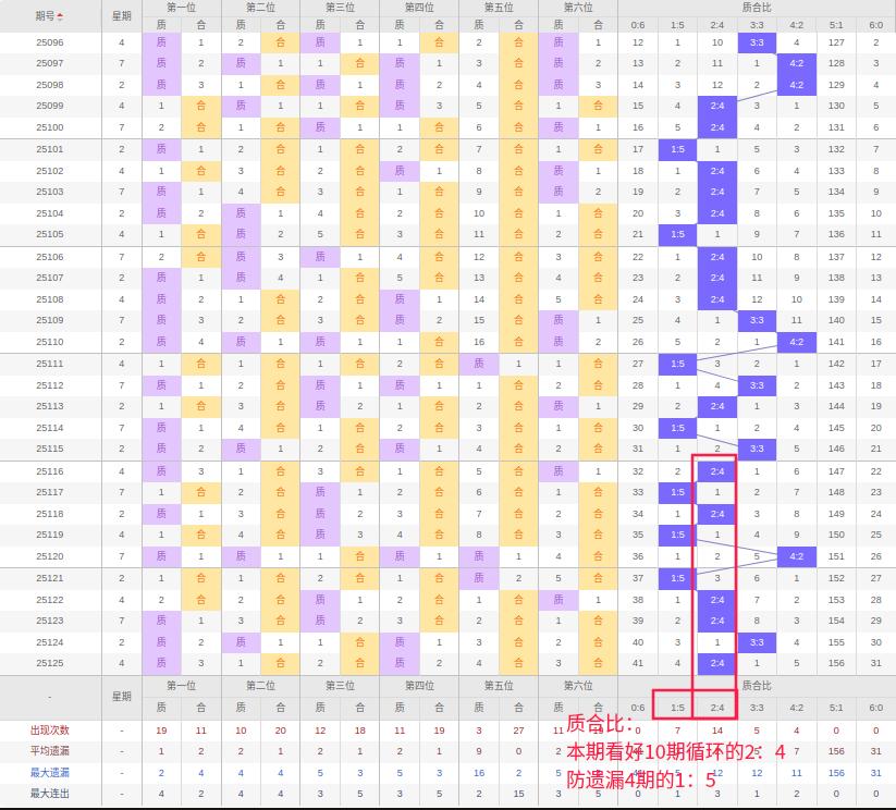 上期质合比:2:4,近10期质合比出现情况:2:4、1:5、2:4、1:5、4:2、1:5、2:4、2:4、3:3、2:4,最近10期出1期3:3,出现1期4:2,出现5期2:4,出现0期5:1,出现3期1:5,出现0期6:0,出现0期0:6,根据近10期规律本期看好连出2:4,防遗漏4期的的1:5,综上所述推荐质合比推荐:1:5,重点关注:2:4。