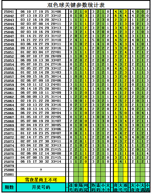 以下是作者手工统计的双色球关键参数统计表,对喜欢参数分析、过滤缩水、选号胆杀的技术性双色球爱好者有所帮助,其它读者可略过不看。