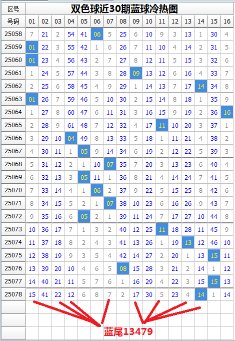 蓝球本期有热蓝8枚,冷蓝8枚,蓝球冷热码数量平分秋色。上期开出热蓝,由于近期蓝球冷热规律紊乱,本期蓝球冷热难定。综合判断,蓝球尾数13479可能性大。