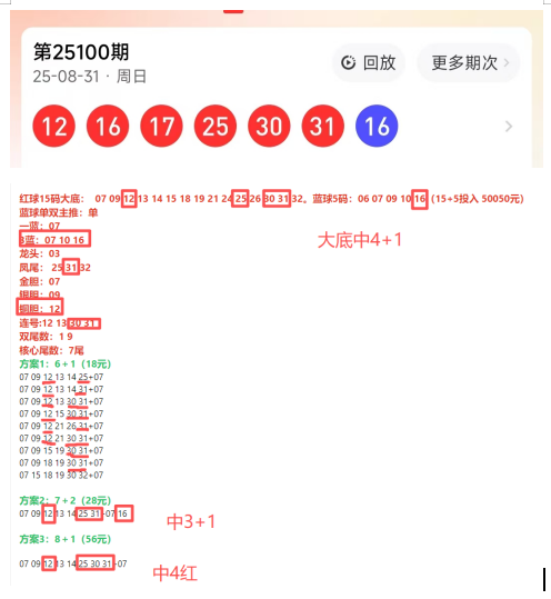 先回顾上期开奖号码:12 16 17 25 30 31—16。上期大底中4+1,方案中出3+1和4+0各一注,本期冲6+1.