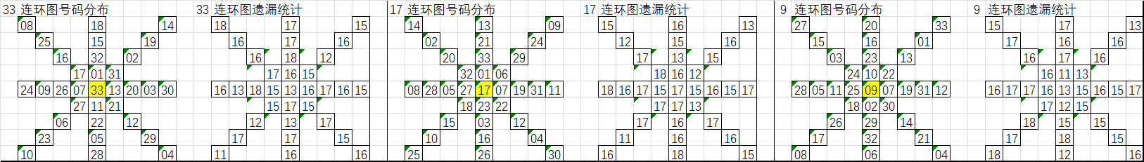 由于数据量大,不一一统计,下图为各个号码分别在33、17、9连环图上的遗漏统计汇总图: