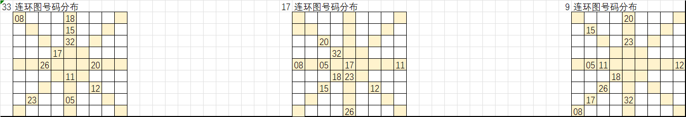 以上是33、17、9的连环图,可以在一起彩平台的九转连环图中查看历期号码分布,以当前期数来看,历史同期共有19期(2003-2023),那么我们就以19期号码来进行遗漏统计,然后把每个号码在近19期的遗漏总数统计出来,分别带入33、17、9的连环图,取出遗漏值大于16的号码,把这些号码在“环上”和“轴上”的相邻号码取出来进行统计,选取出次前15的号码作为大底。