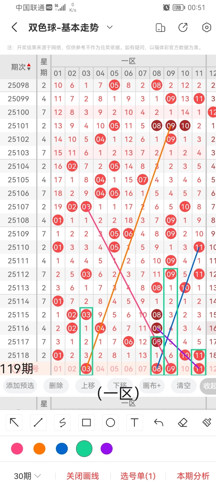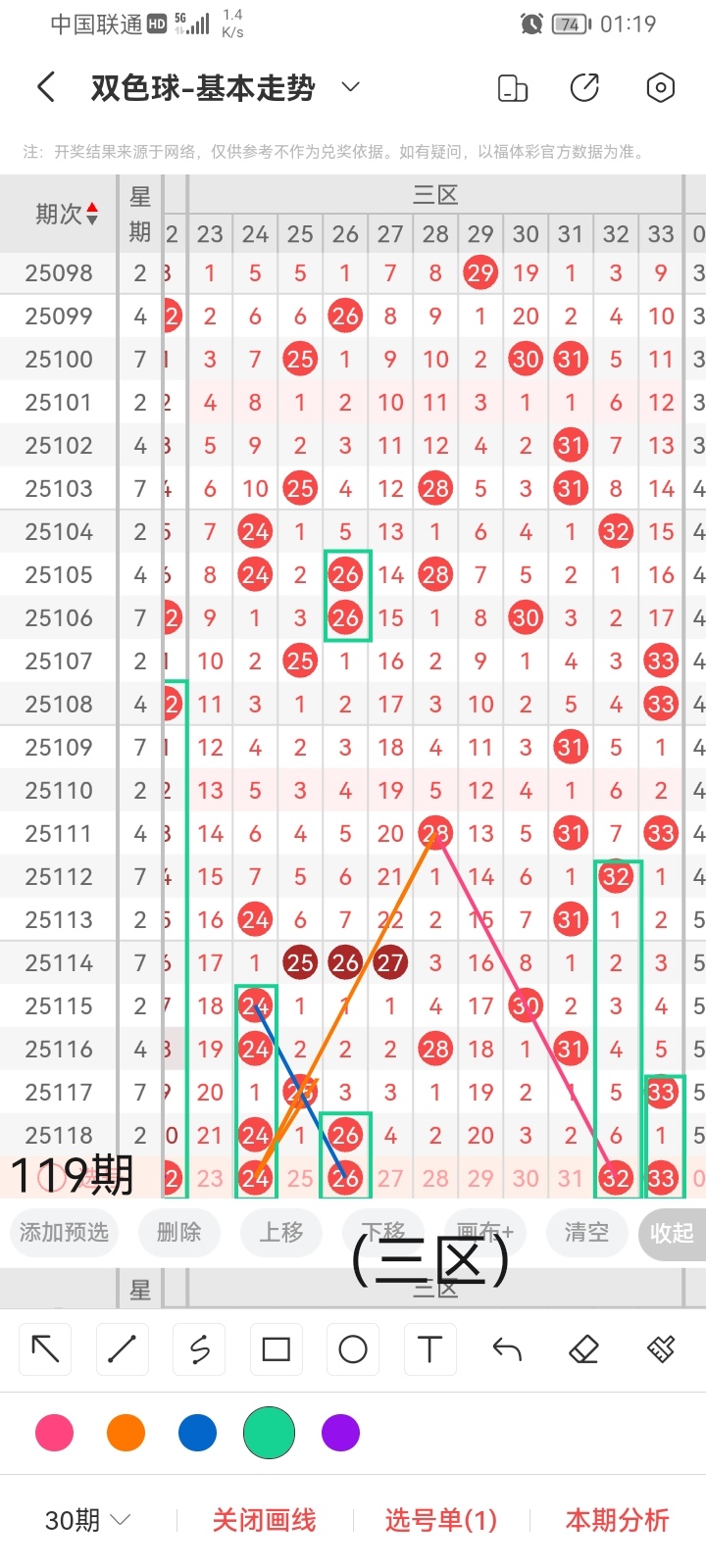 通过以上对上期的简单回顾,下面进入双色球第2025119期(下面简称本期)的选号分析: