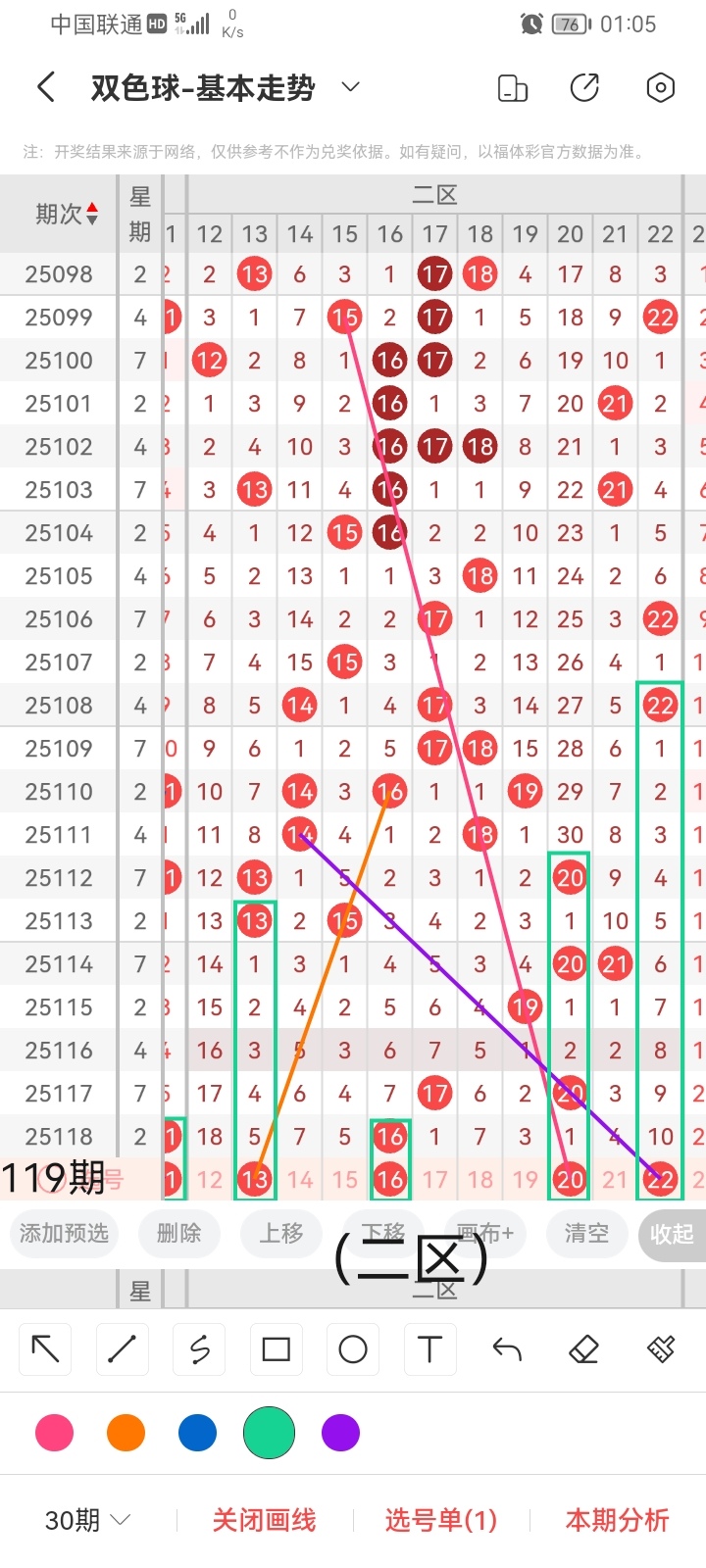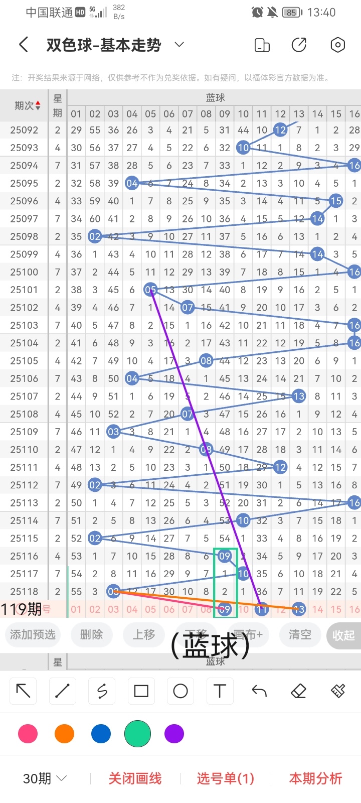 小梁根据图中画线思路,最后给大家汇总提供一下本期红球、蓝球数据,供大家参考: