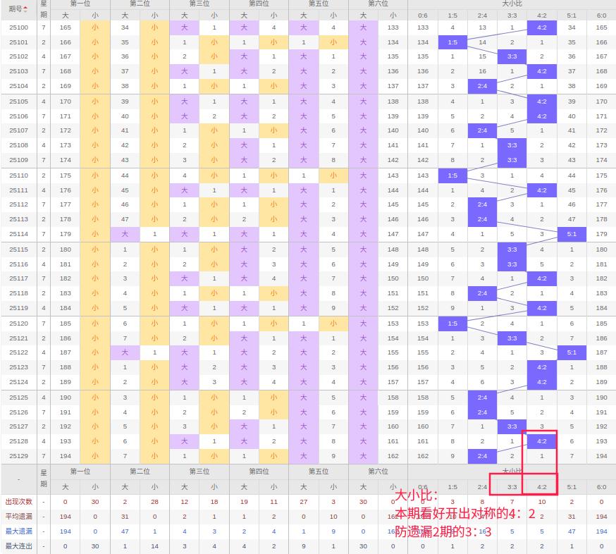 上期大小比:2:4,近10期大小比出现情况:1:5、3:3、5:1、4:2、4:2、2:4、2:4、3:3、4:2、2:4,最近10期出现2期3:3,出现3期4:2,出3期2:4,出现1期5:1,出现1期1:5,出现0期6:0,出现0期0:6,根据近10期规律本期看好对称4:2,防遗漏2期的3:3,综上所述推荐大小比推荐:3:3,重点关注:4:2。