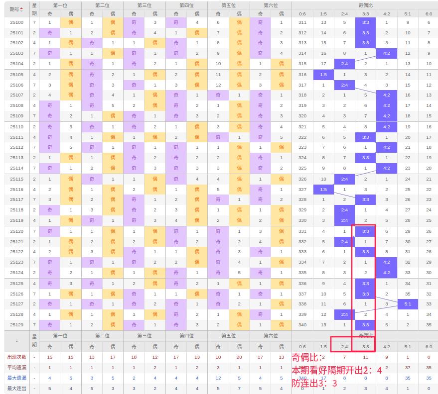 上期奇偶比:3:3,近10期奇偶比出现情况:3:3、2:4、3:3、4:2、4:2、3:3、3:3、3:3、2:4、3:3,最近10期出现6期3:3,出现2期4:2,出现2期2:4,出现0期5:1,出现0期1:5,出现0期6:0,出现0期0:6,根据近10期规律本期看好隔期开出2:4,防连出3:3,综上所述推荐奇偶比推荐:3:3,重点关注:2:4。