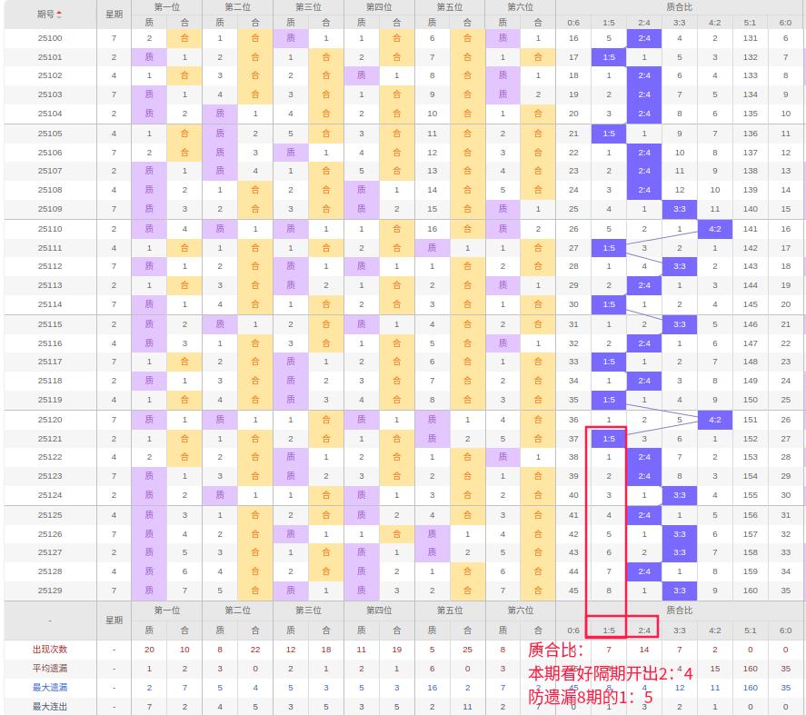 上期质合比:3:3,近10期质合比出现情况:1:5、4:2、1:5、2:4、2:4、3:3、2:4、3:3、2:4、3:3,最近10期出2期3:3,出现1期4:2,出现4期2:4,出现0期5:1,出现2期1:5,出现0期6:0,出现0期0:6,根据近10期规律本期看好隔期出2:4,防遗漏8期的1:5,综上所述推荐质合比推荐:1:5,重点关注:2:4。