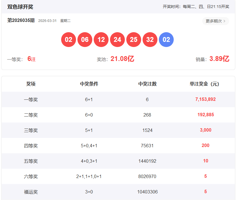 双色球上期开奖结果:02.06.12.24.25.32+02