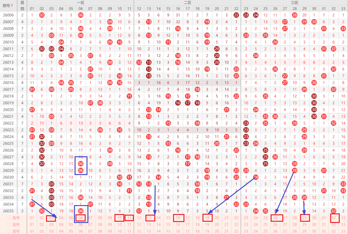 每次对于热码防守是必不可少的,第一区我本期考虑的还是围绕最近的热码做号,一是考虑重号数字6,再一个就是斜连号03。对于数字彩大多数就是看运气,不管你用什么技巧来分析,6个号码能够分析出来两三个就算很厉害了,然后最难的问题就是搭配组合,如果用最小的付出收获大的回报,这才是关键点。