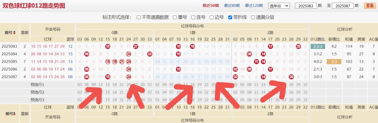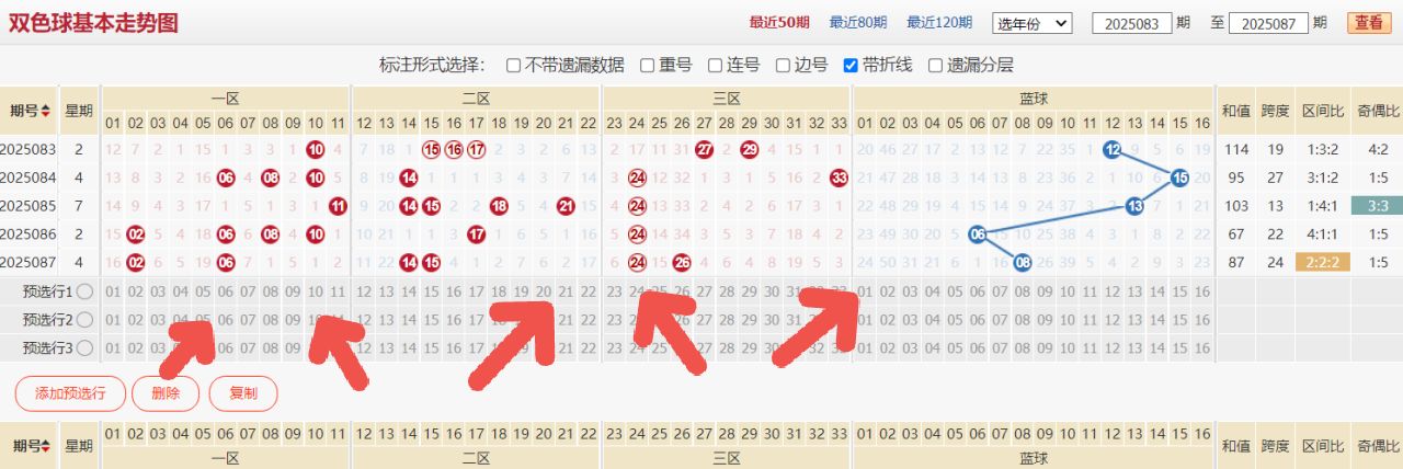 上期双色球的开奖号码为:02 06 14 15 24 26+08,和值为87,跨度为24,区间比例为2:2:2,奇数偶数比例为1:5,012路比例为3:0:3。上机号码整体的难度成分还是聚焦在重号这里。不过在重号的焦灼之中,穿插了连号等性质,这一块的内容相对来说还是比较困难的。那么本期需要去破除这样的一个热号粘性。以达到冷热搭配的核心效果,这是本期号码的初始基本思路。