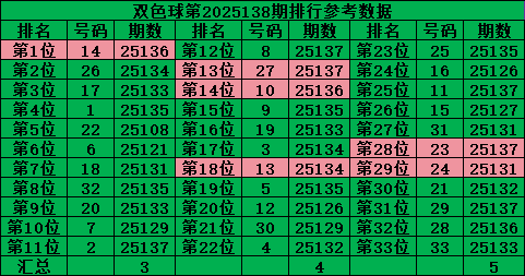 以双色球自开奖以来每个号码出现的次数排位,可分为冷热温三区: