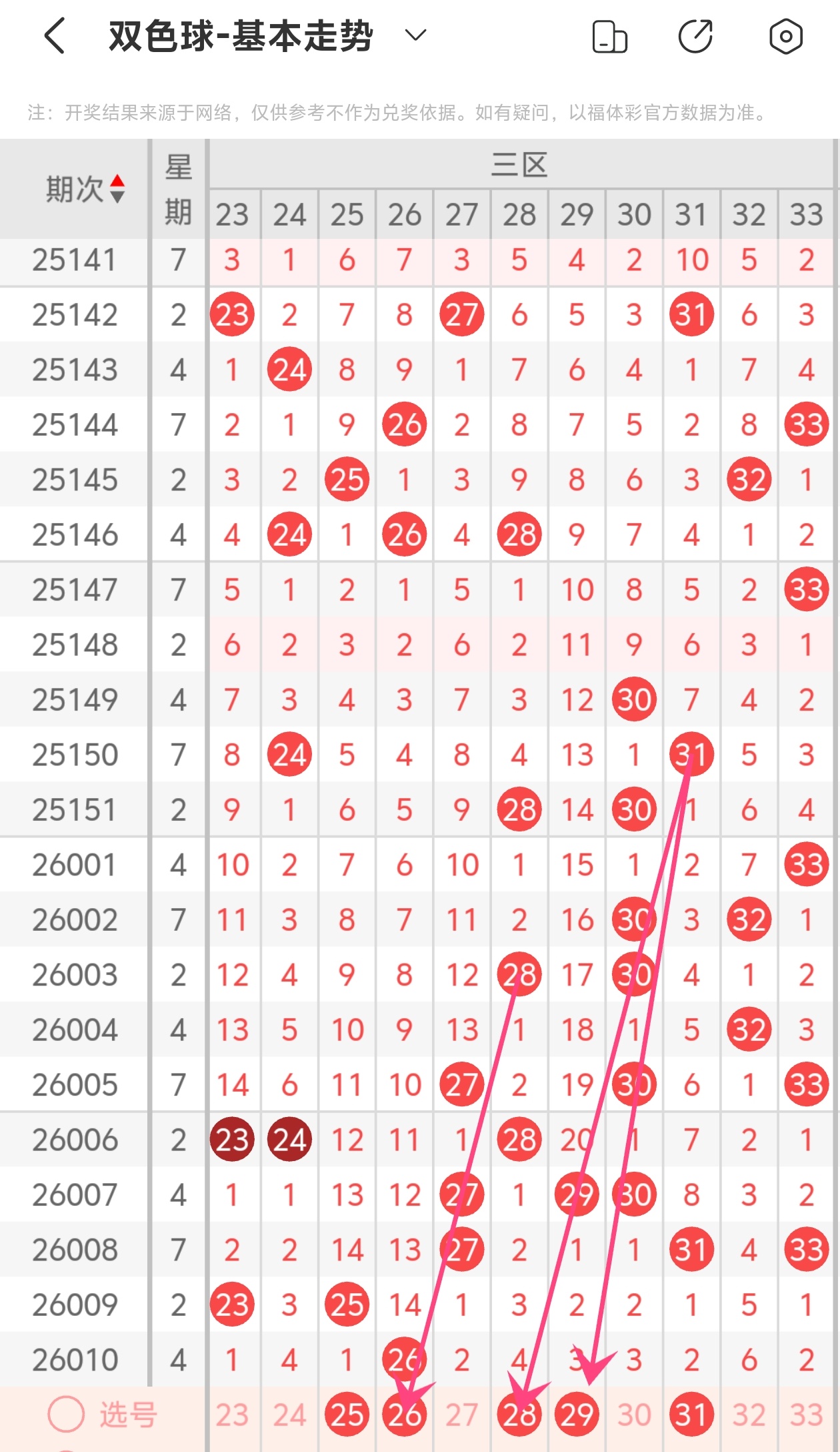上期第三区间开出26,本期我们可以从上面走势图中看到选号的思路,26为斜连走势,28为斜连走势,29为斜连走势,综合以上分析本期第三区间推荐25 26 28 29 31